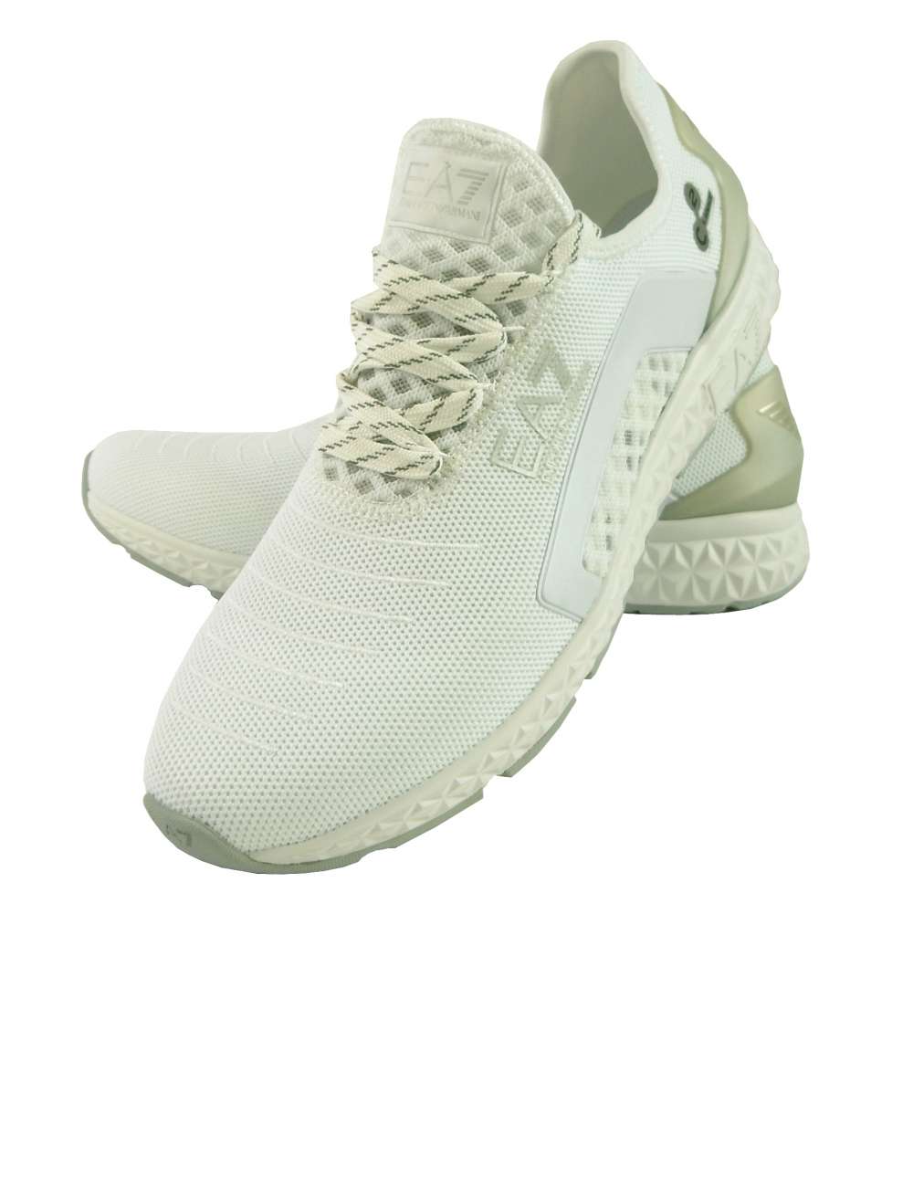 ホワイト×シルバーのコンビネーションに、踵にはアルマーニシンボルのイーグルデザインのゴールドラバーを施しています。
