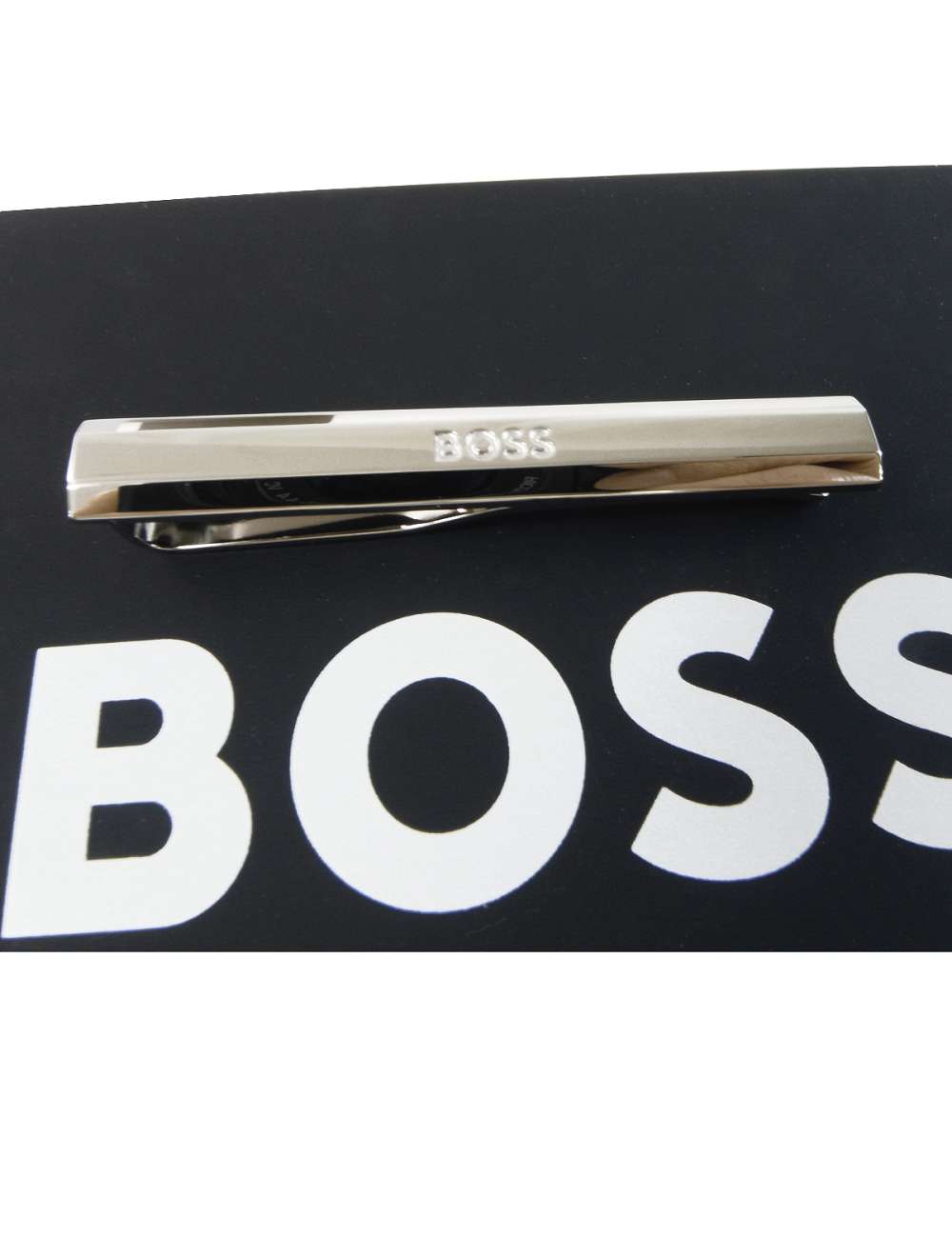 HUGO BOSSの2025年新作ネクタイピン。光沢のあるシルバーブラスにBOSSのロゴが刻印されています。贈り物にも素敵です。