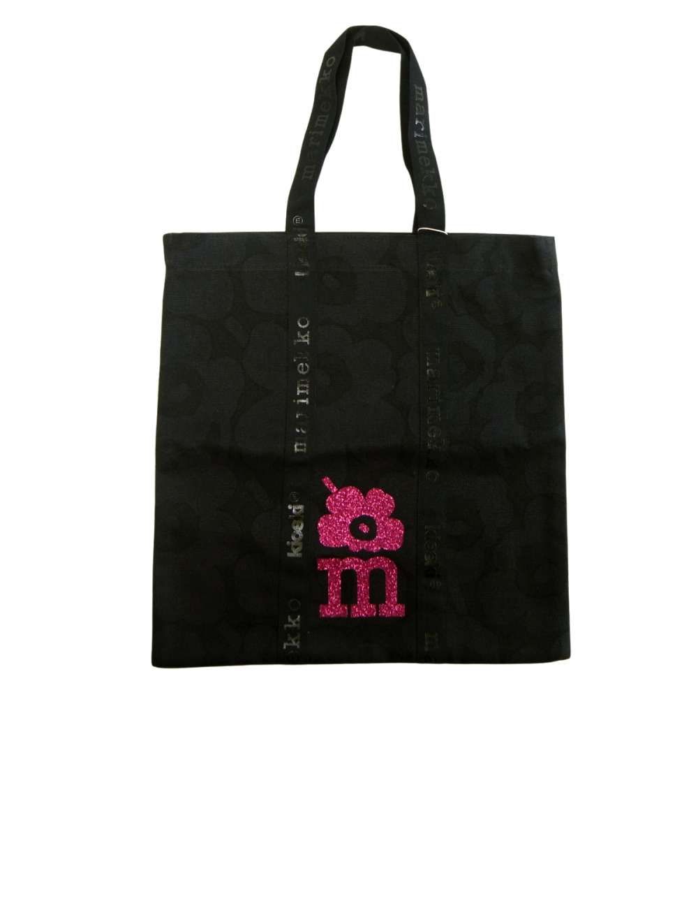 マリメッコの伝統的なウニッコ柄が織り込まれたコットンキャンバス生地に、鮮やかなピンクラメで、mの頭文字とウニッコが描かれています。