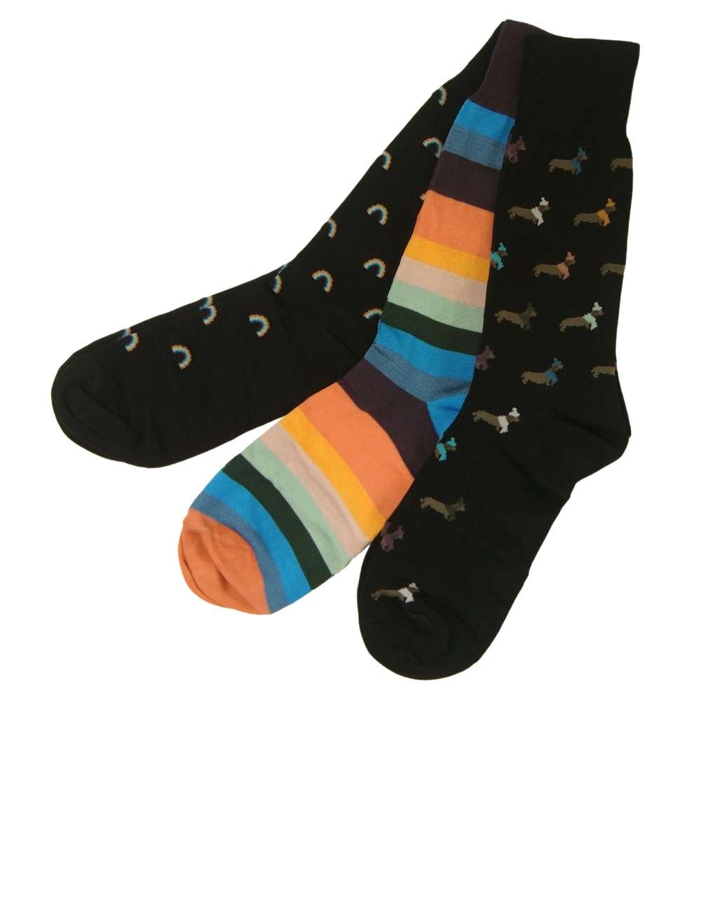 ポールスミスの象徴的なマルチカラーのストライプ柄と、ダックスフンド柄、レインボー柄の3足セットです。