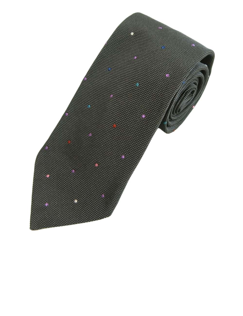 シックなダークグレーのシルク生地に織り込まれたカラフルなドット柄が綺麗に映えます。