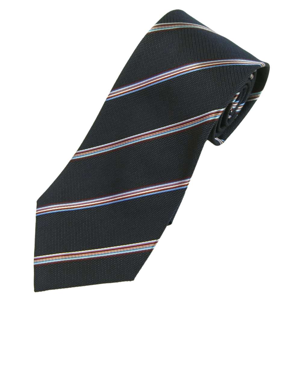 ネイビーカラーのジャガードシルクに2パターンのマルチストライプのシルクラインが交互にデザインされたお洒落なネクタイ。