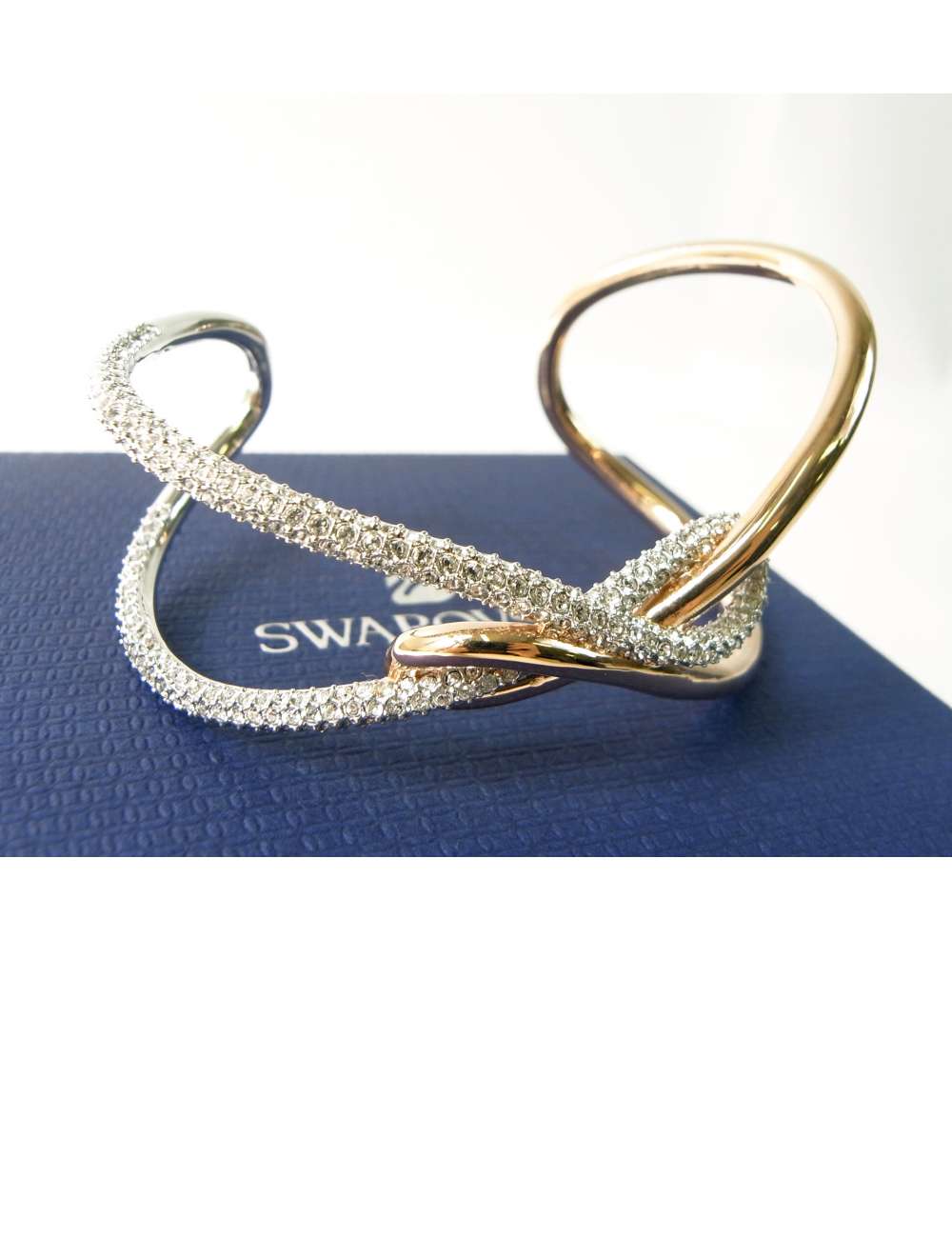 ホワイトパヴェクリスタルとローズゴールドメタルで作られた、2つの無限のシンボルが、美しい曲線を描きながら絡み合い、永遠の愛を象徴しています。