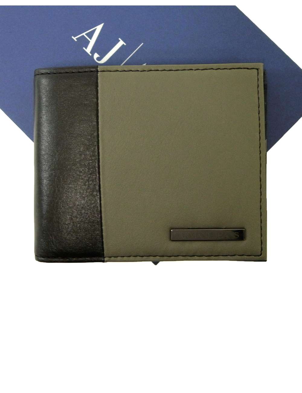 アルマーニジーンズの二つ折り札入れ。スタイリッシュな配色レザーのコンビネーション素材。ARMANI JEANSのガンメタルプレートがあしらわれています。*小銭入れは付属しておりません。ご注意くださいませ。