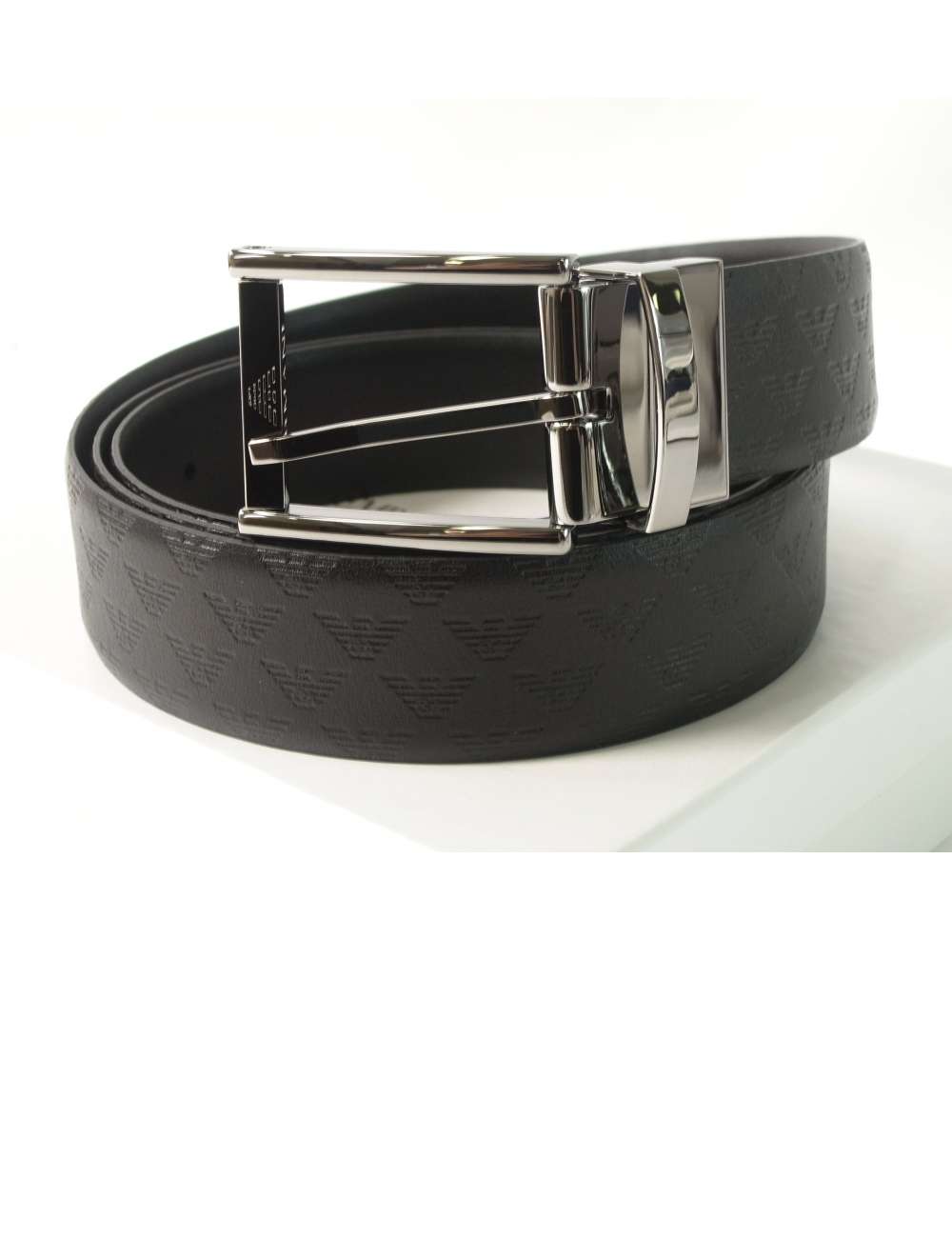 アルマーニの象徴シンボル・イーグルの型押しと、ブラック無地のリバーシブルデザイン。