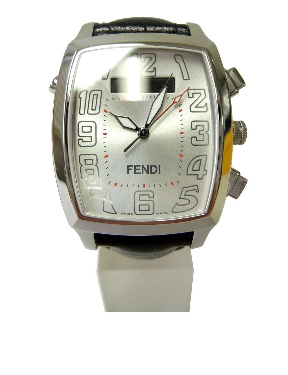| 仕様 | ケースサイズ:縦約40mm横35mm ケース厚:約10mm 時計全長:約255mm 腕周り:約190mm〜235mm(7穴調節) デジタルディスプレイ アラーム機能 5気圧防水 スイス製 ☆フェンディの箱、保証書が付属しています。 |