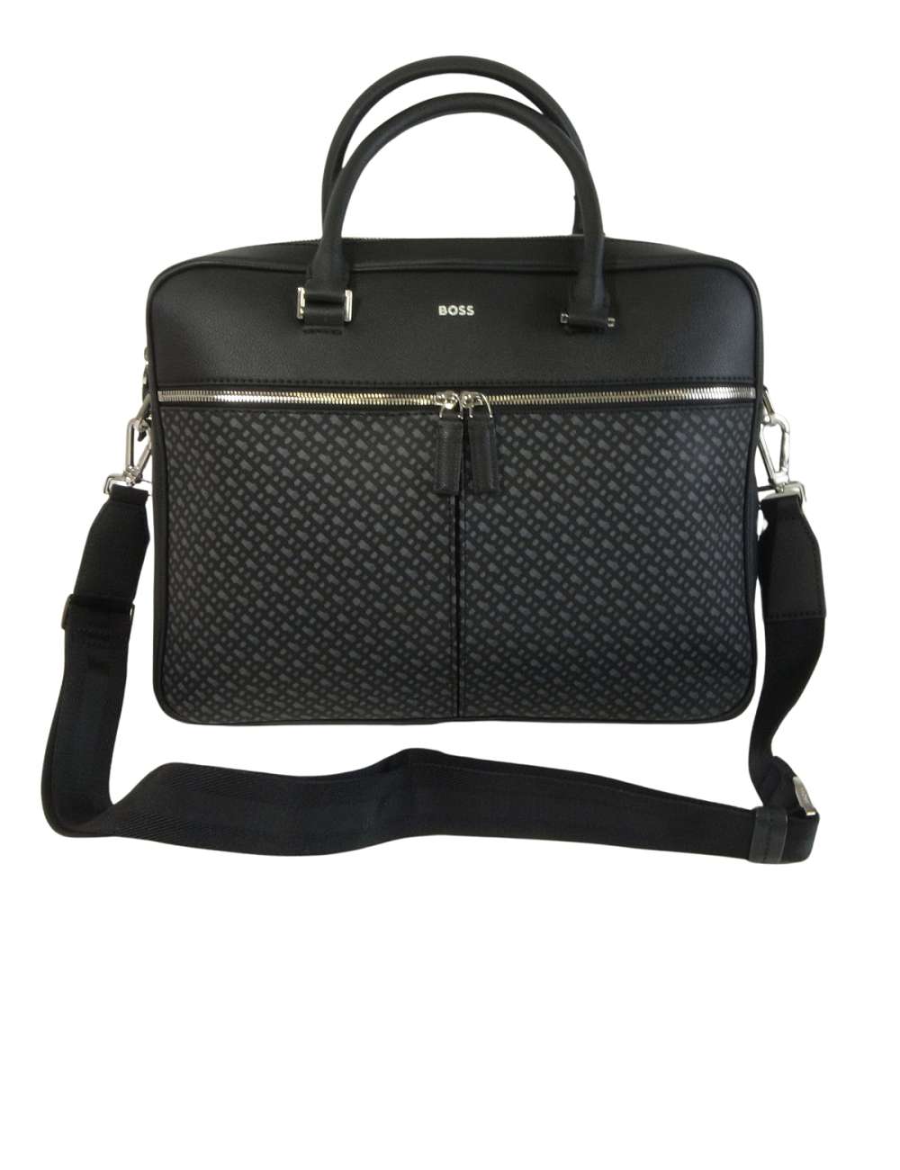 BOSSのイニシャルBのモノグラムが全体に施されたスタイリッシュなデザイン。