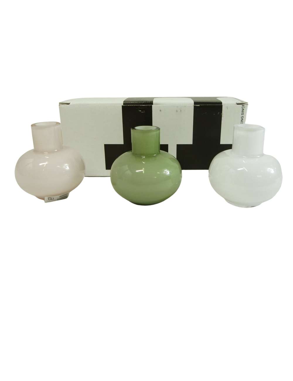 淡い色彩で清潔感のあるオリーブ、ホワイト、ピンクのフラワーベースセット。