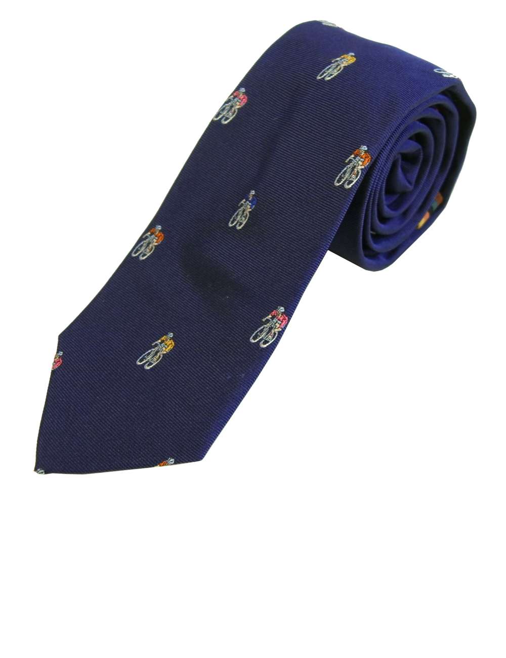英国人気ブランドポールスミスのネクタイ。シルク100%の織地にサイクリング柄が刺繍織りされています。ポップでカラフルなドット柄の裏地とのマッチングもかなりオシャレです。*ポールスミスのネクタイケースが付属しております。