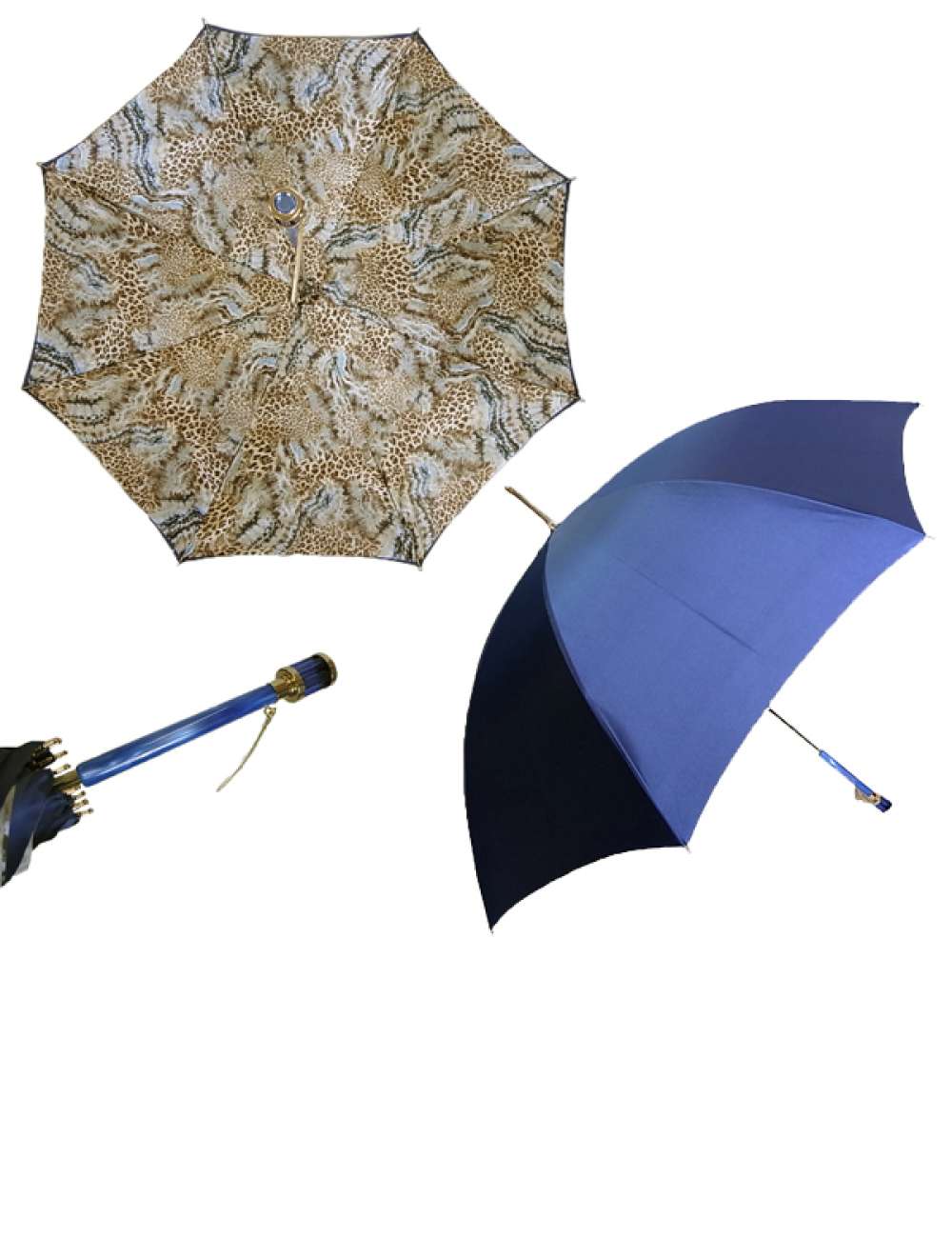| カラー | パラソル部分 表側:ネイビー〜ブルーグラデーション 内側:レオパード(豹)柄 ハンドル部分:ブルー+ゴールド 石突き部分:ゴールド |