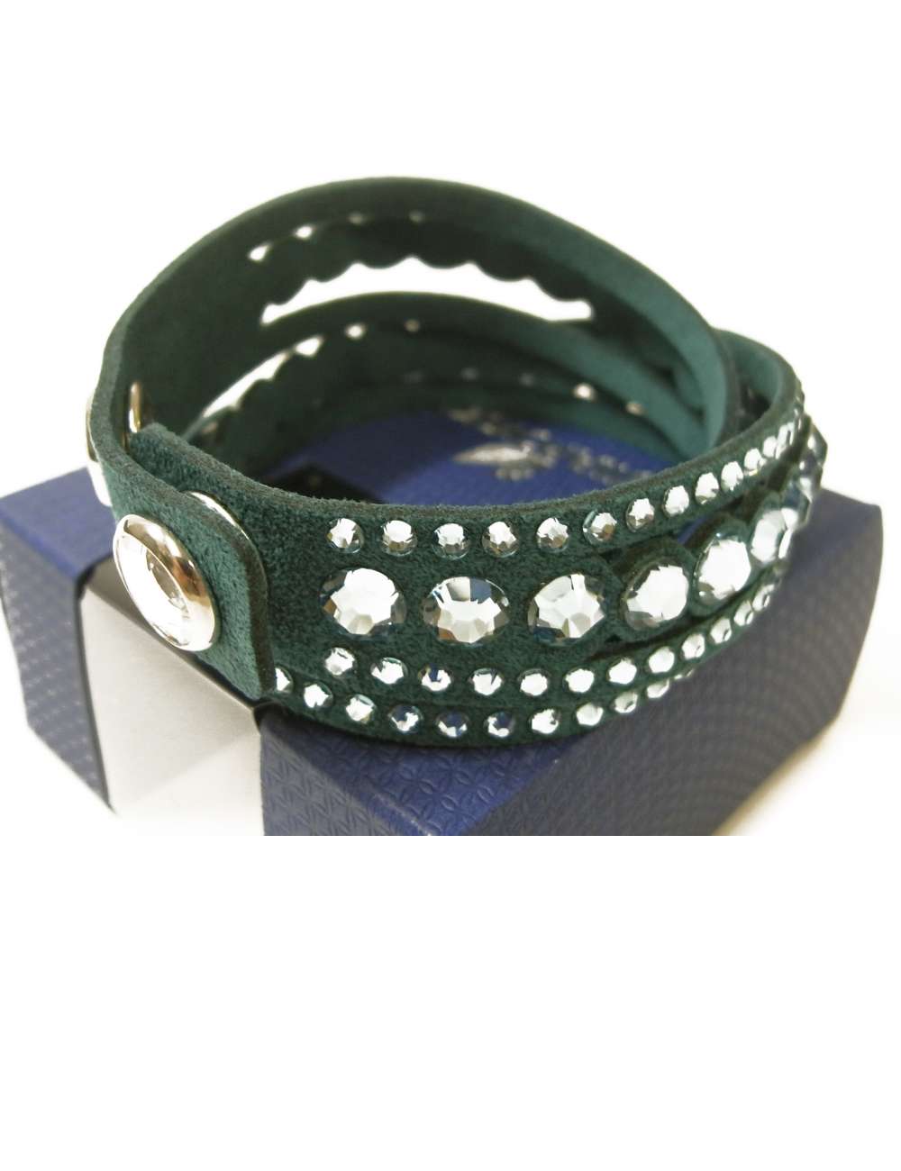 肌触りの良いスウェード調のグリーンレザーに、ラウンドカットのアクアカラーのクリスタルが惜しみなく散りばめられています。