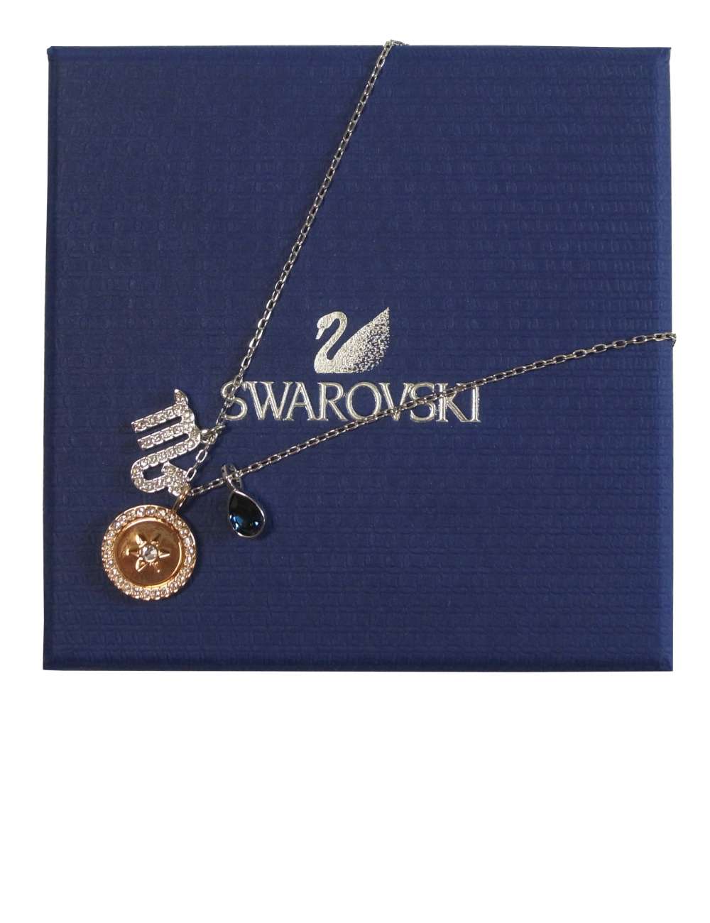 神秘的なさそり座を象ったペンダントです♪チェーンの一部が取り外しできるので、ローズゴールドメタルにクリアクリスタルが埋め込まれたメダリオンと、ロジウムにサファイアブルーのクリスタルが煌めくペアシェイプのモチーフは外すことも可能です。