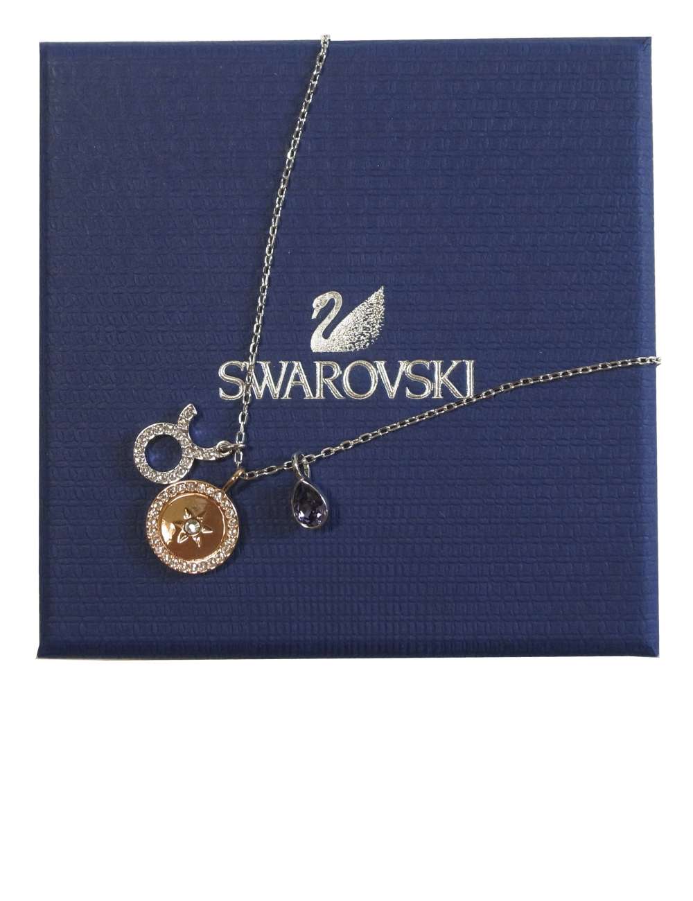 おうし座を象ったペンダントです♪チェーンの一部が取り外しできるので、ローズゴールドメタルにクリアクリスタルが埋め込まれたメダリオンと、ロジウムにパープルのクリスタルが煌めくペアシェイプのモチーフは外すことも可能です。