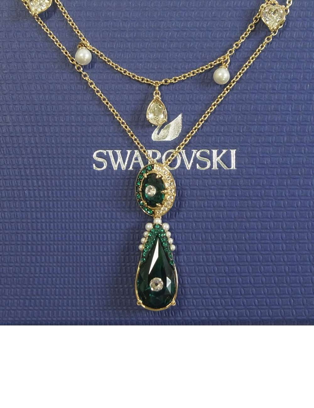 気品あるエメラルドグリーンを主役に、ヴィンテージ風かつ爽やかな煌めきを表現したロングネックレスと、小さなハート、ティアドロップ、クリスタルパールが柔らかく煌めくショートネックレス。