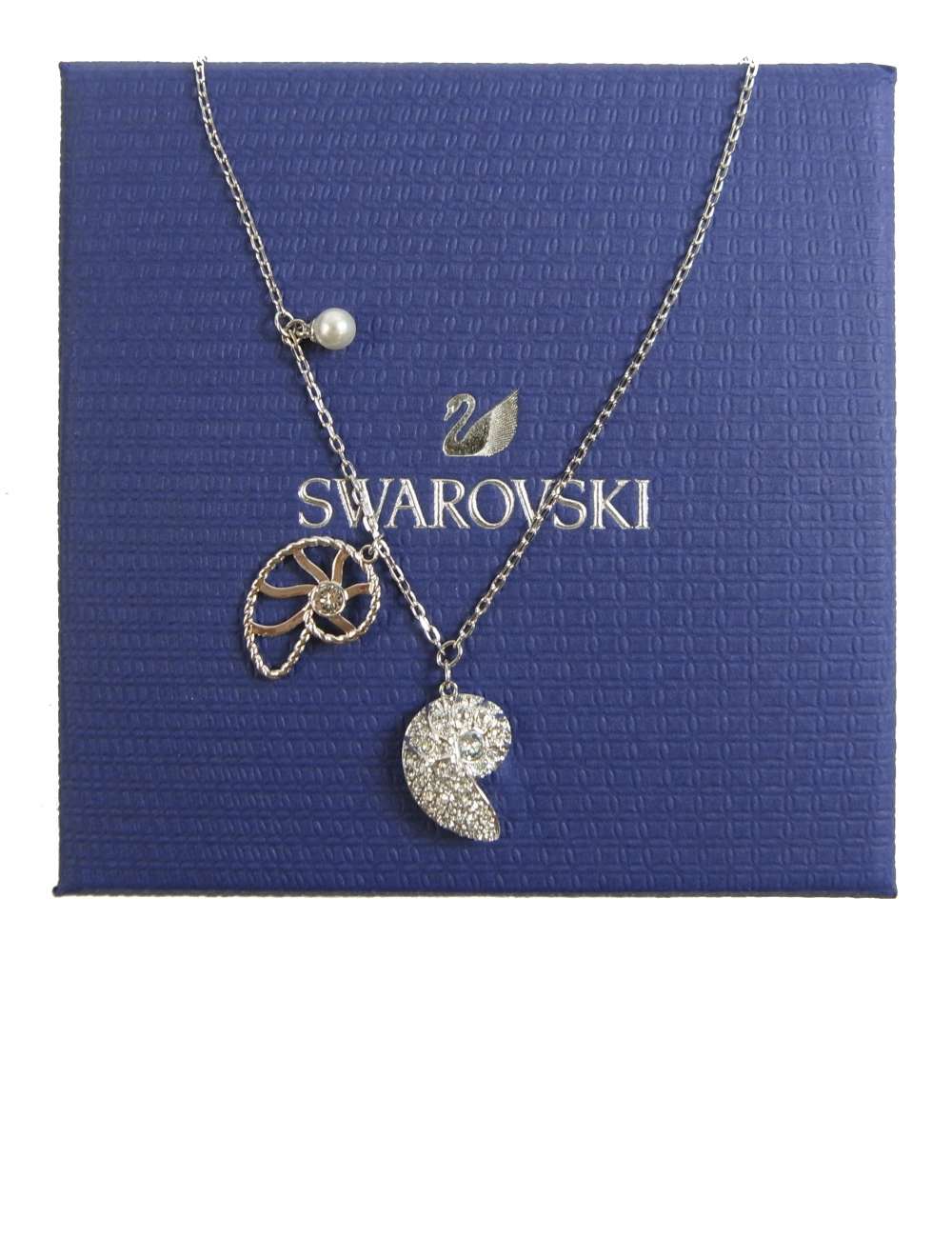 海をイメージさせるシェルペンダントは夏にぴったり!ホワイトとブルーのクリスタルが煌めく2つの貝殻モチーフに、クリスタルパールが寄り添うロマンチックなデザインです。