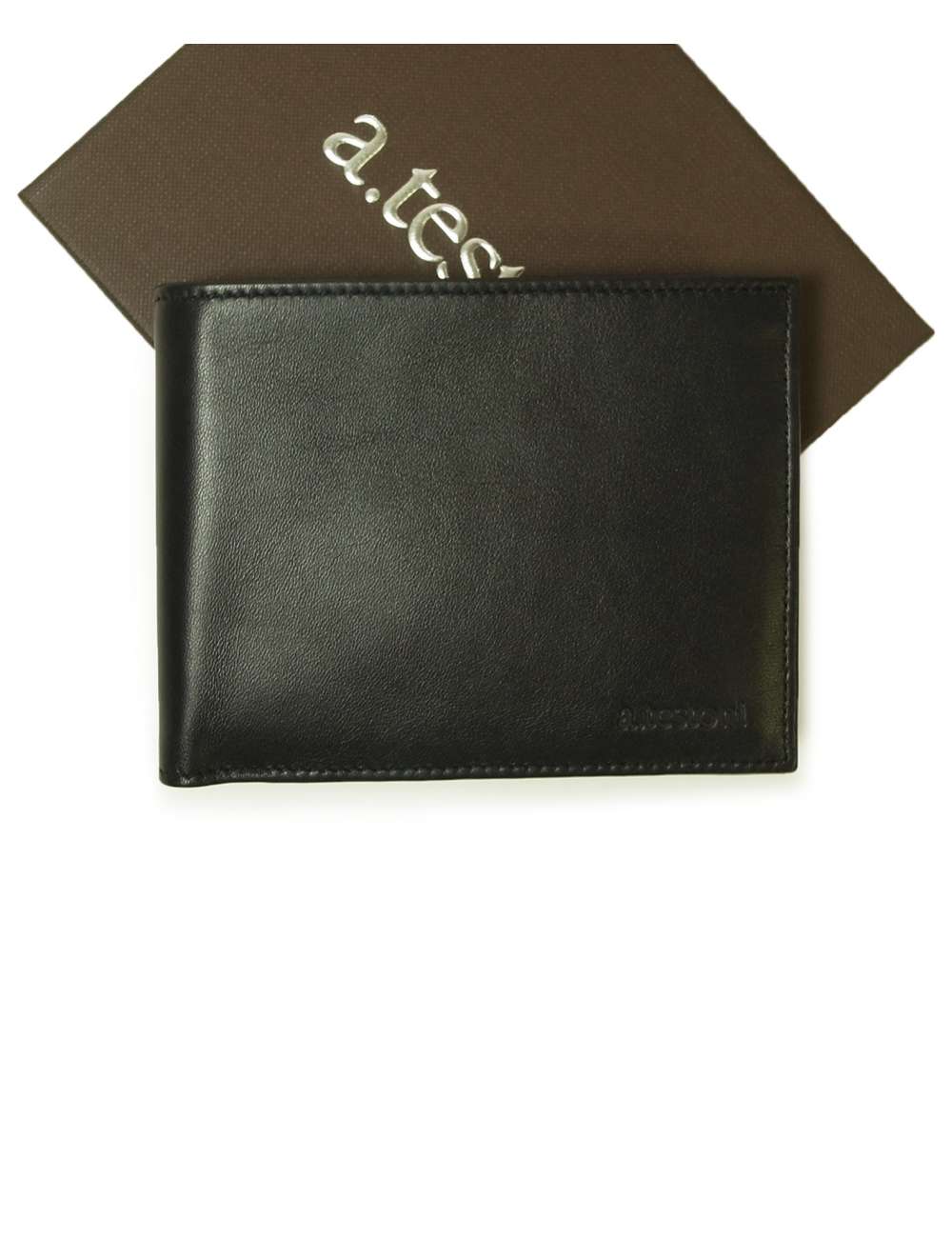柔らかな子牛革で作られた小銭入れ付き財布です。定番ブラックは人気のカラーです。a.testoniの刻印がさりげなく型押しされています。
